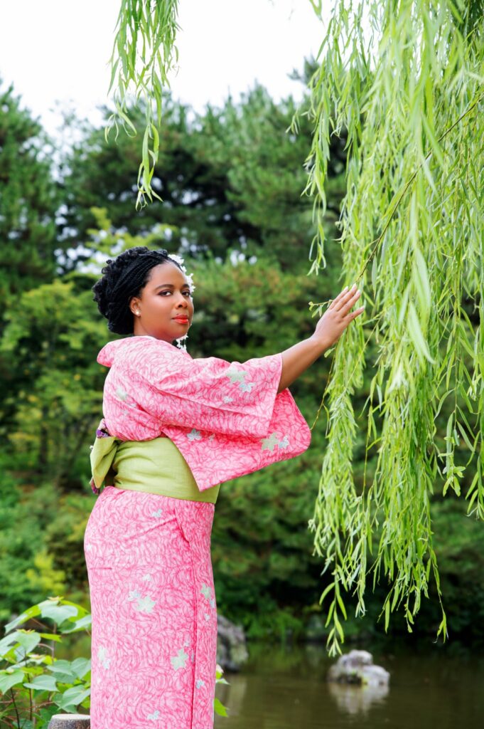 What made this experience even more meaningful was the care and attention of the kimono artists. From the moment I walked into the shop, they treated me with such warmth and respect. Although I usually represent pink and green—Skee-Wee to all my Sorors out there—this time I let them take the lead. When I saw the kimono they picked, I couldn’t help but grin. Let’s just say, it was a divine alignment I didn’t expect but completely embraced.